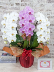 おめでたい紅白の胡蝶蘭。大輪の胡蝶蘭ですので、大きくて立派。白の鳴滝清流胡蝶蘭とピンクの大輪を同時に楽しめます。